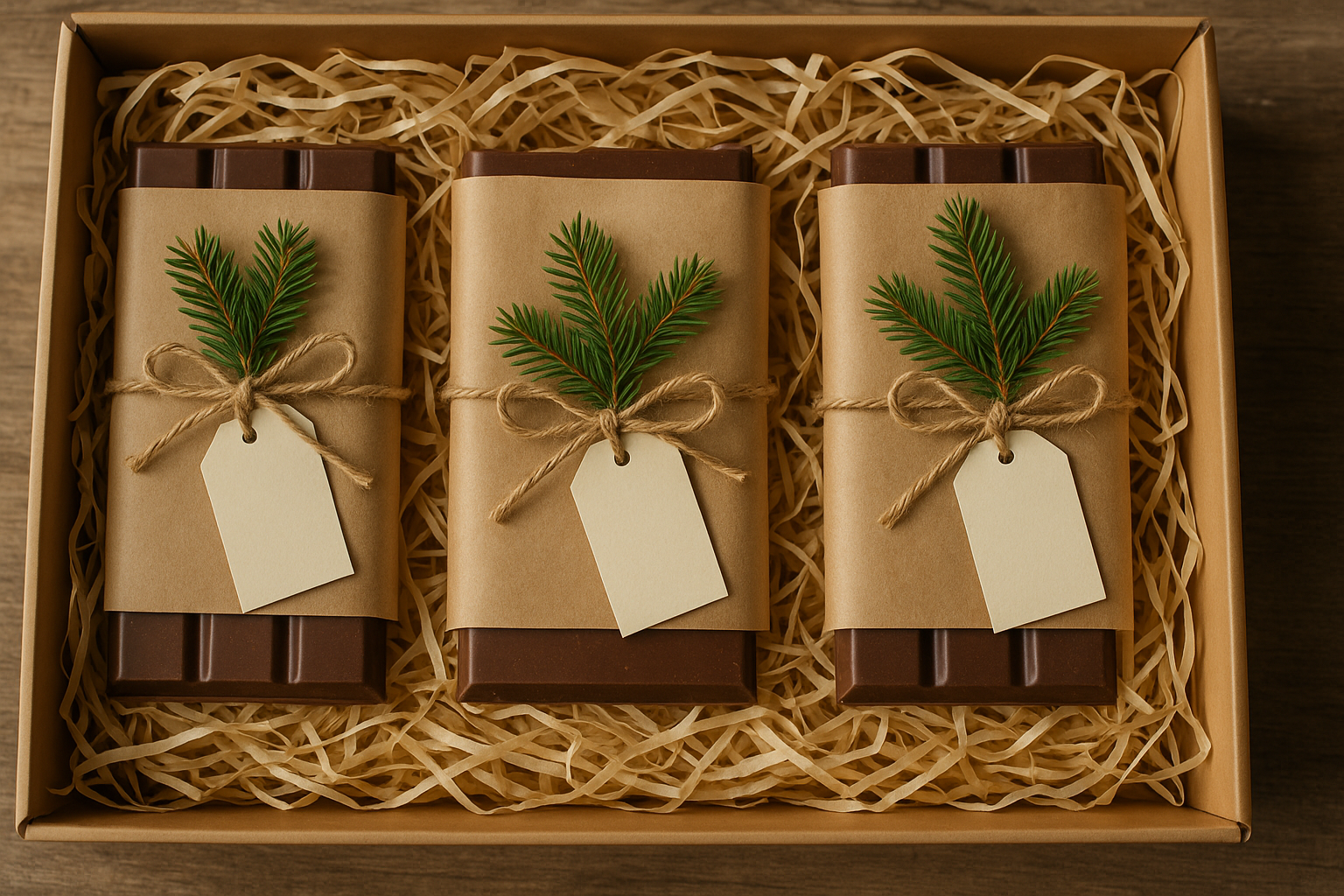Чтобы домашний шоколад выглядел как настоящий новогодний подарок, достаточно простых приёмов. Заверните его в крафт-бумагу или пергамент с зимним узором. Перевяжите шпагатом или лентой, украсьте веточкой ели, палочкой корицы или сушёным апельсином. Добавьте наклейку или бирку с пожеланием. Можно сделать мини-наборы: плитку горького шоколада, молочного и белого, каждый с разной начинкой. Положите в коробочку, добавьте немного наполнителя, вложите карточку с рецептом или добрыми словами — и ваш подарок готов.