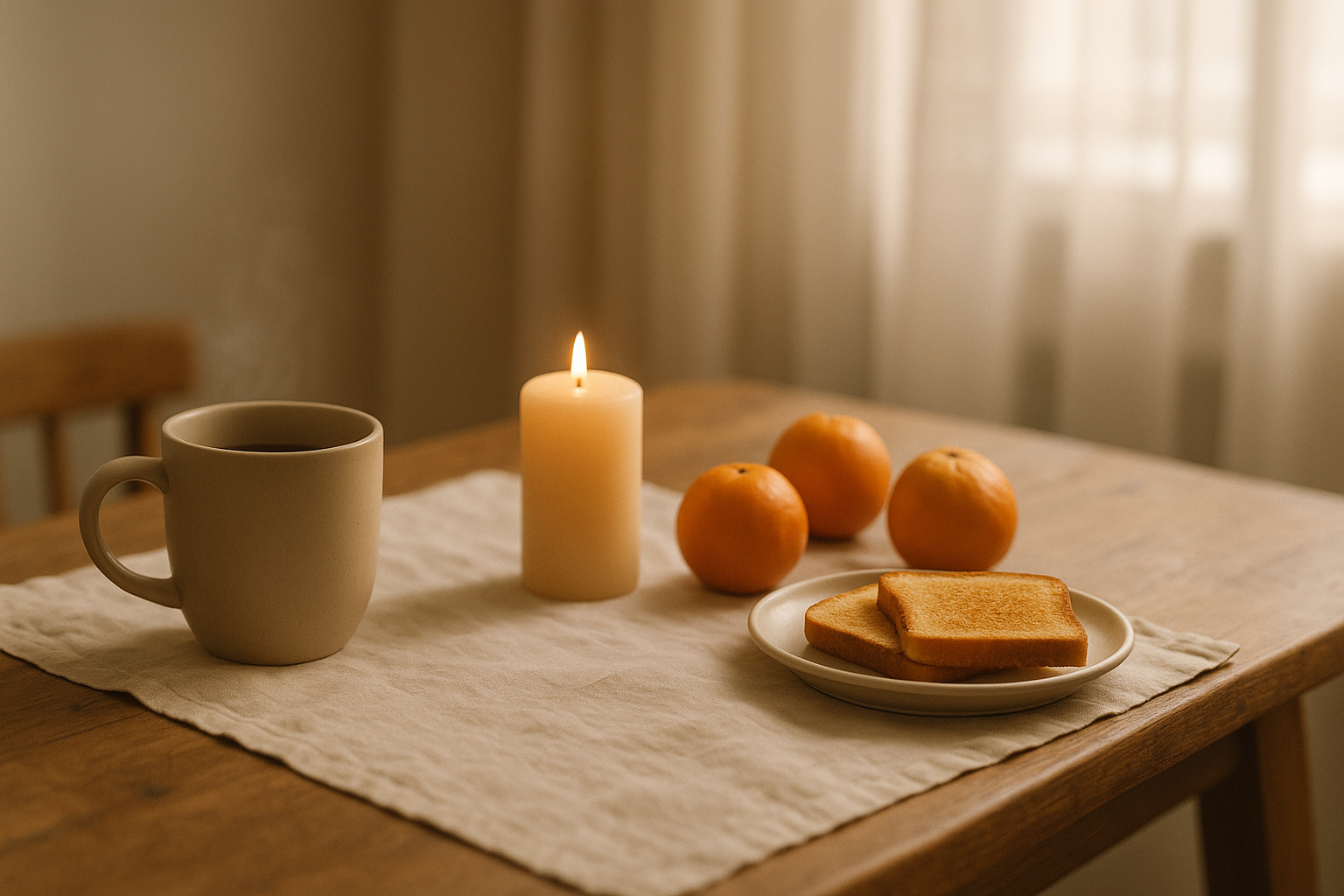 Вы выходите на кухню в тишине. Стол накрыт скатертью. На нём — свеча в банке, чашка, и остатки мандаринов. Вы завариваете чай, садитесь и... молчите. Тепло.