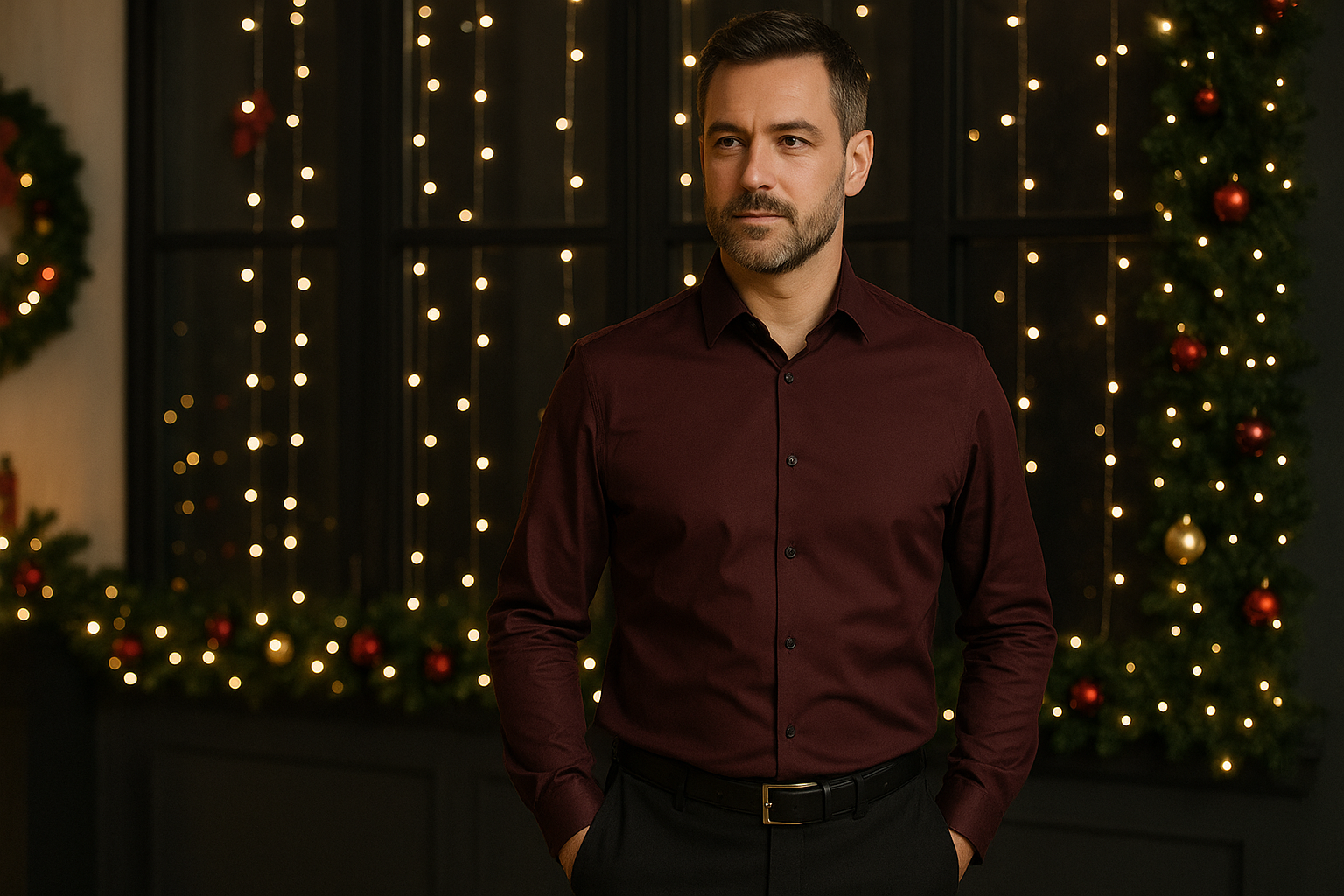 - Мужские варианты: рубашка бордового цвета + брюки, трикотажный джемпер в терракотовой гамме + тёмные джинсы для домашнего праздника.